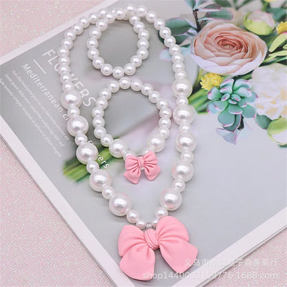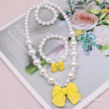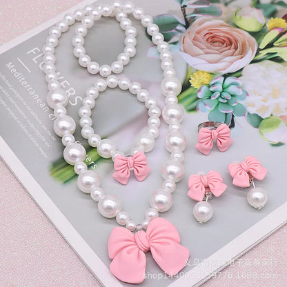 Children's necklace suit - cute bow pearl necklace bracelet earrings ring girl jewelry set student gift!
