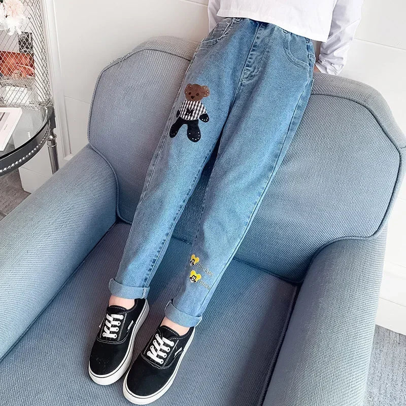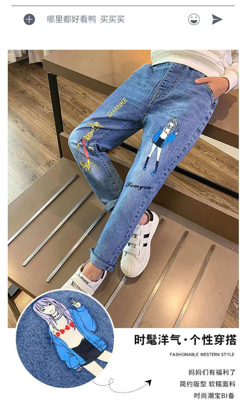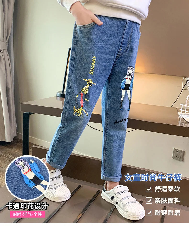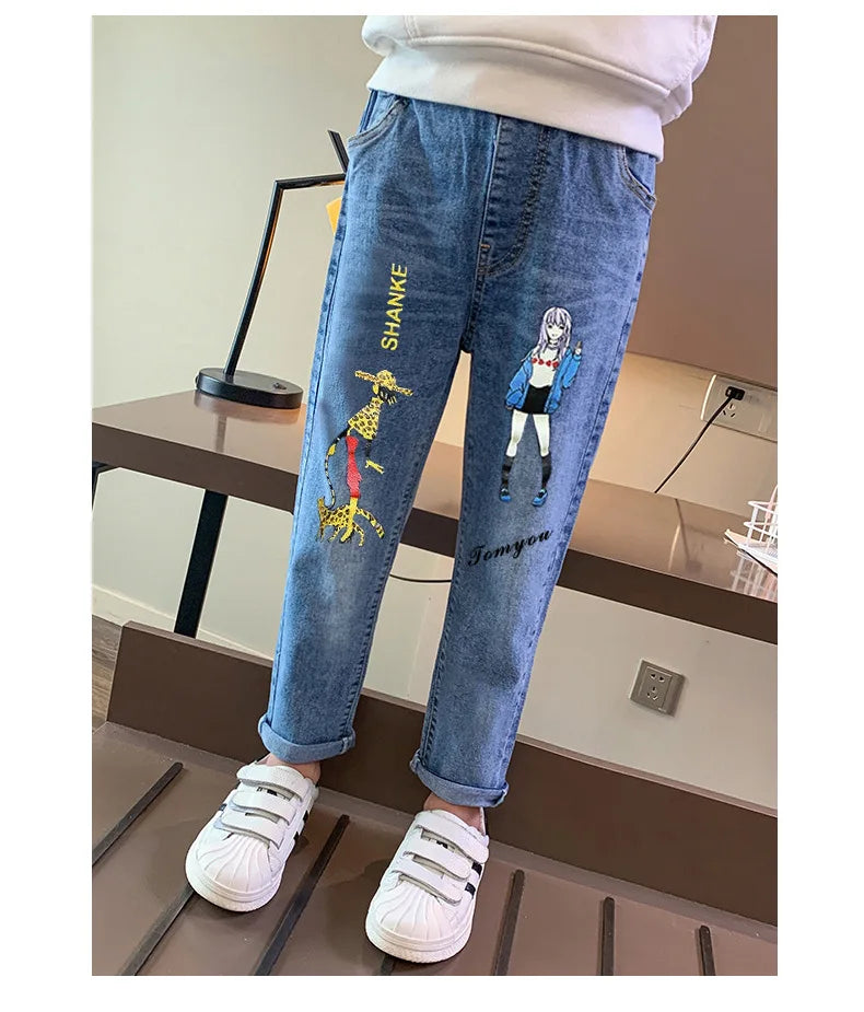 Girls Jeans Children's Clothes Kids Cartoon Printed Elastic Waist Denim Pants 2022 Spring 3 To 12Yrs Teenagers Trousers